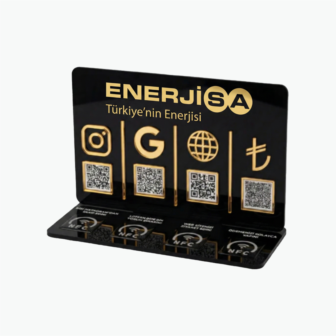 Birebir Senkron Dijital Çözüm: QR kod ve NFC teknolojisi %100 senkronize çalışır. Müşteriniz standın üzerindeki QR kodu okuttuğunda veya telefonunu NFC alanına dokundurduğunda, aynı dijital platforma (Google yorum, Instagram, WhatsApp, web sitesi, harita veya özel link) anında yönlendirilir.